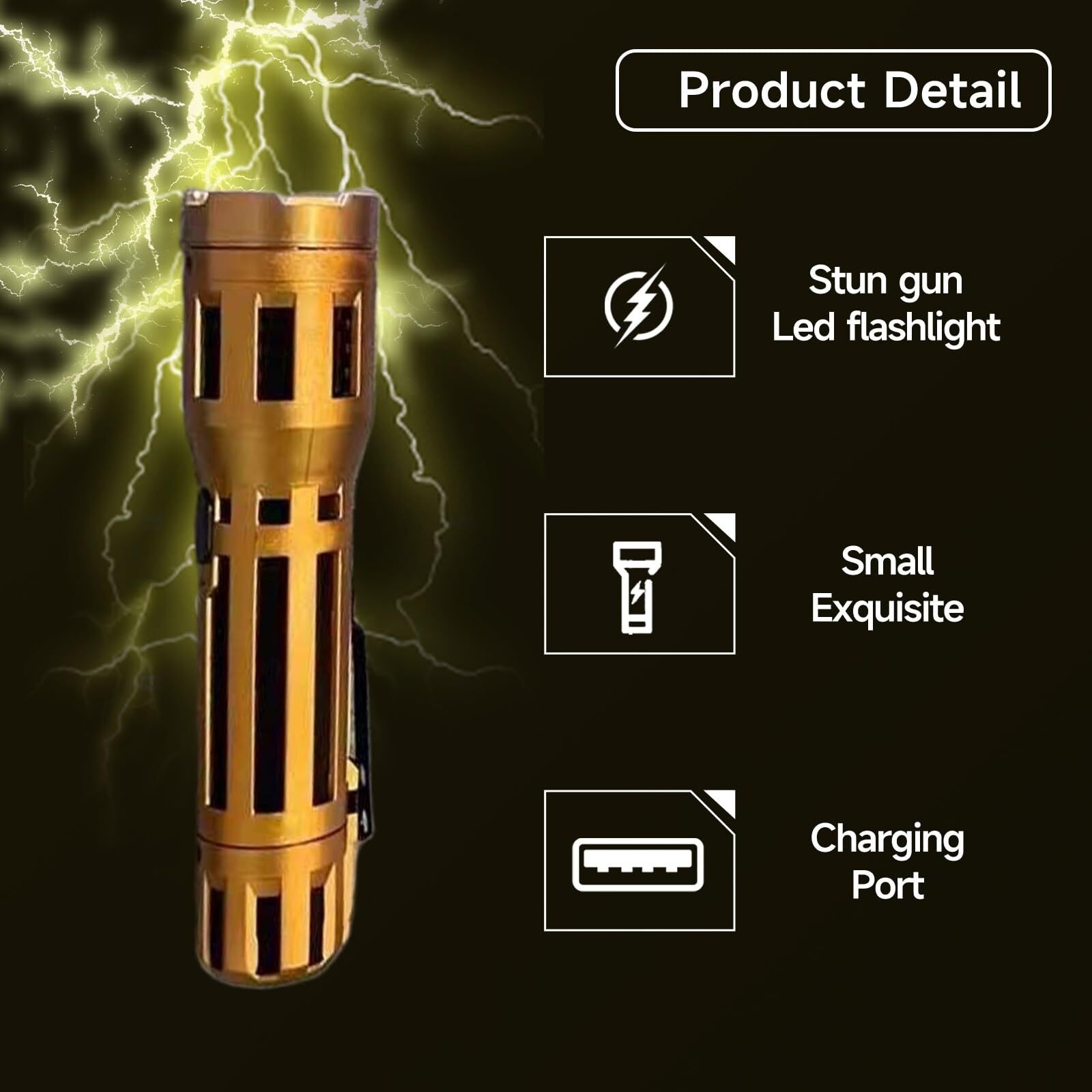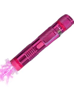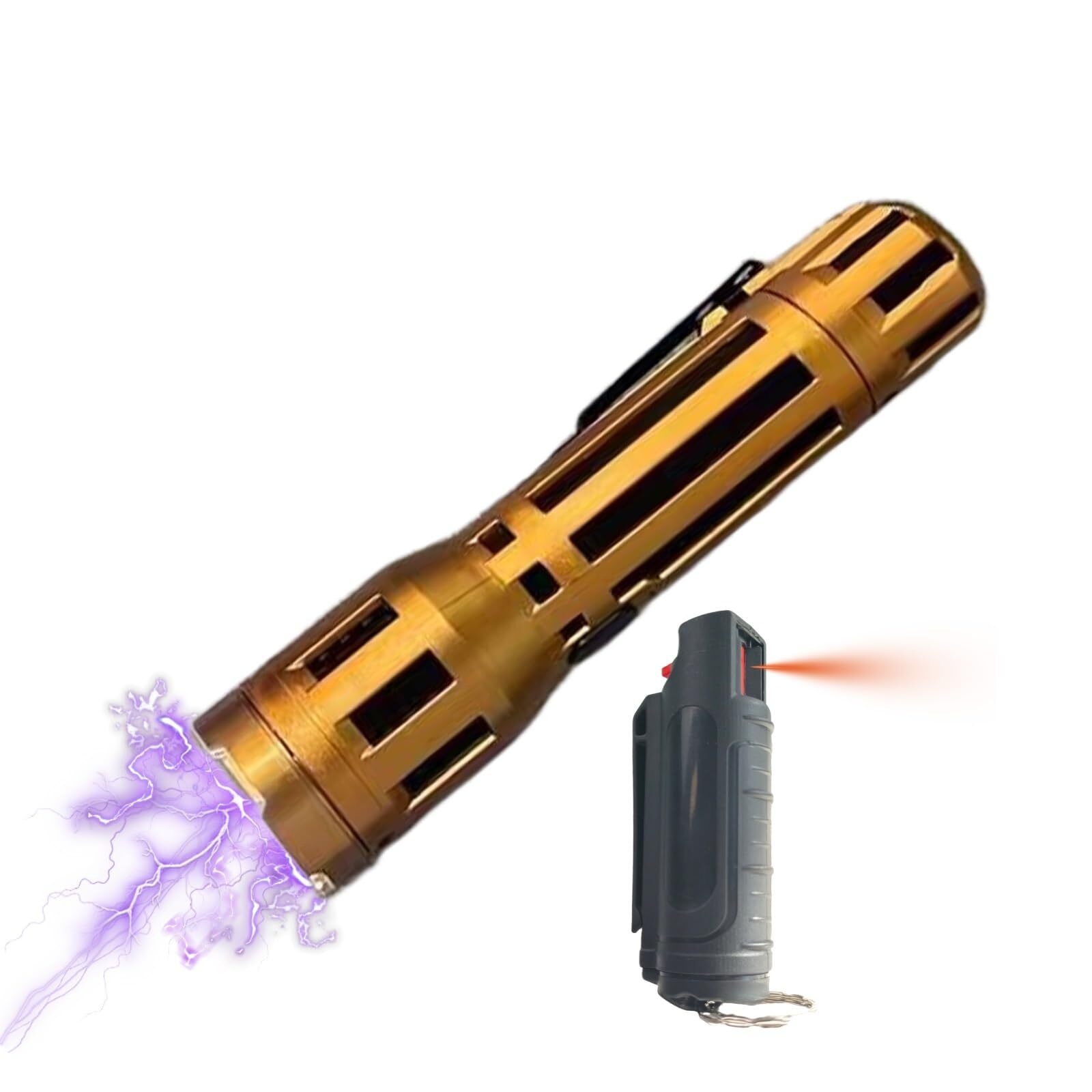 Blending sleek design with powerful performance, this gold-tone stun gun and pepper spray combo is ideal for individuals seeking stylish safety. The rechargeable stun flashlight emits a high-voltage arc and includes a bright LED light for night use and intimidation. Its gold body offers a modern touch while maintaining rugged durability.