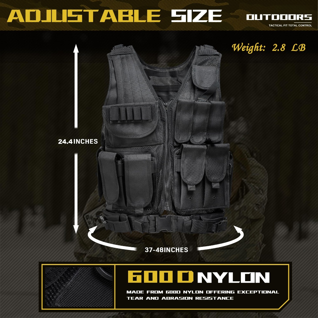 Outdoors Tactical Vest, 600D Encrypted Polyester Adjustable Lightweight Airsoft Vest for Playing or Training